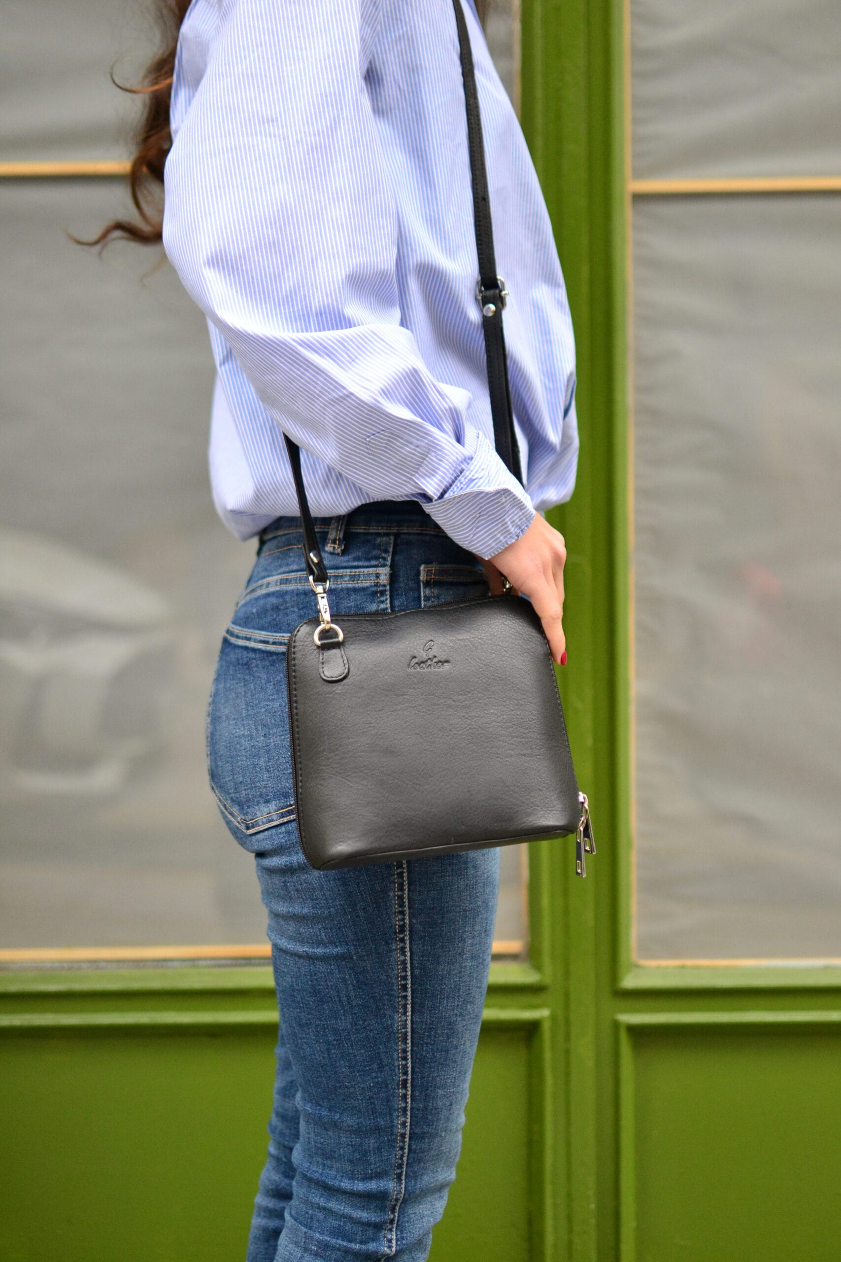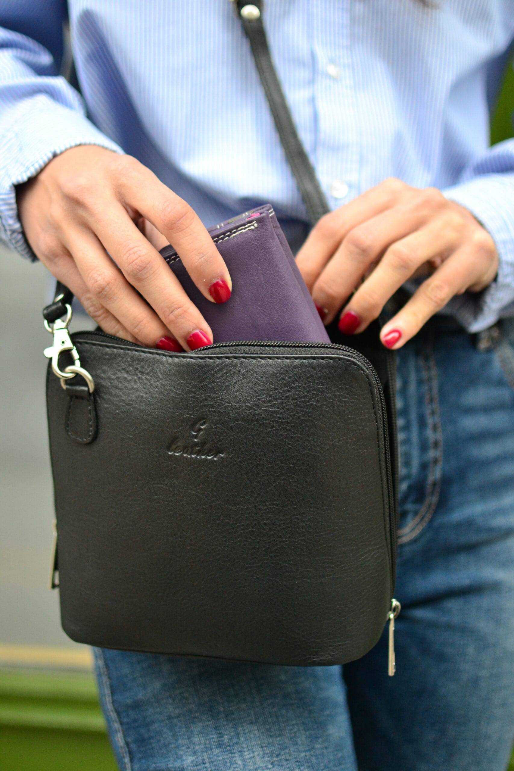 Δερμάτινη τσάντα με αποσπώμενο λουράκι. Στο εωτερικό διαθέτει δύο κύριες θέσεις και μία μικρότερη με φερμουάρ, καθώς και θηκάκι με φερμουάρ στο πίσω μέρος.
