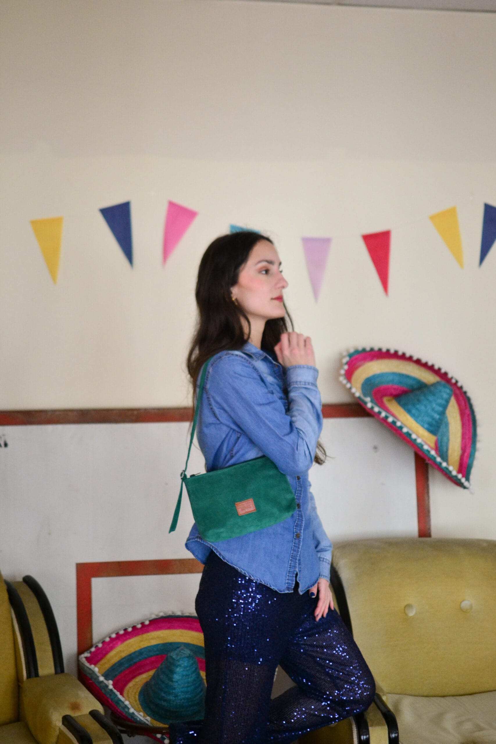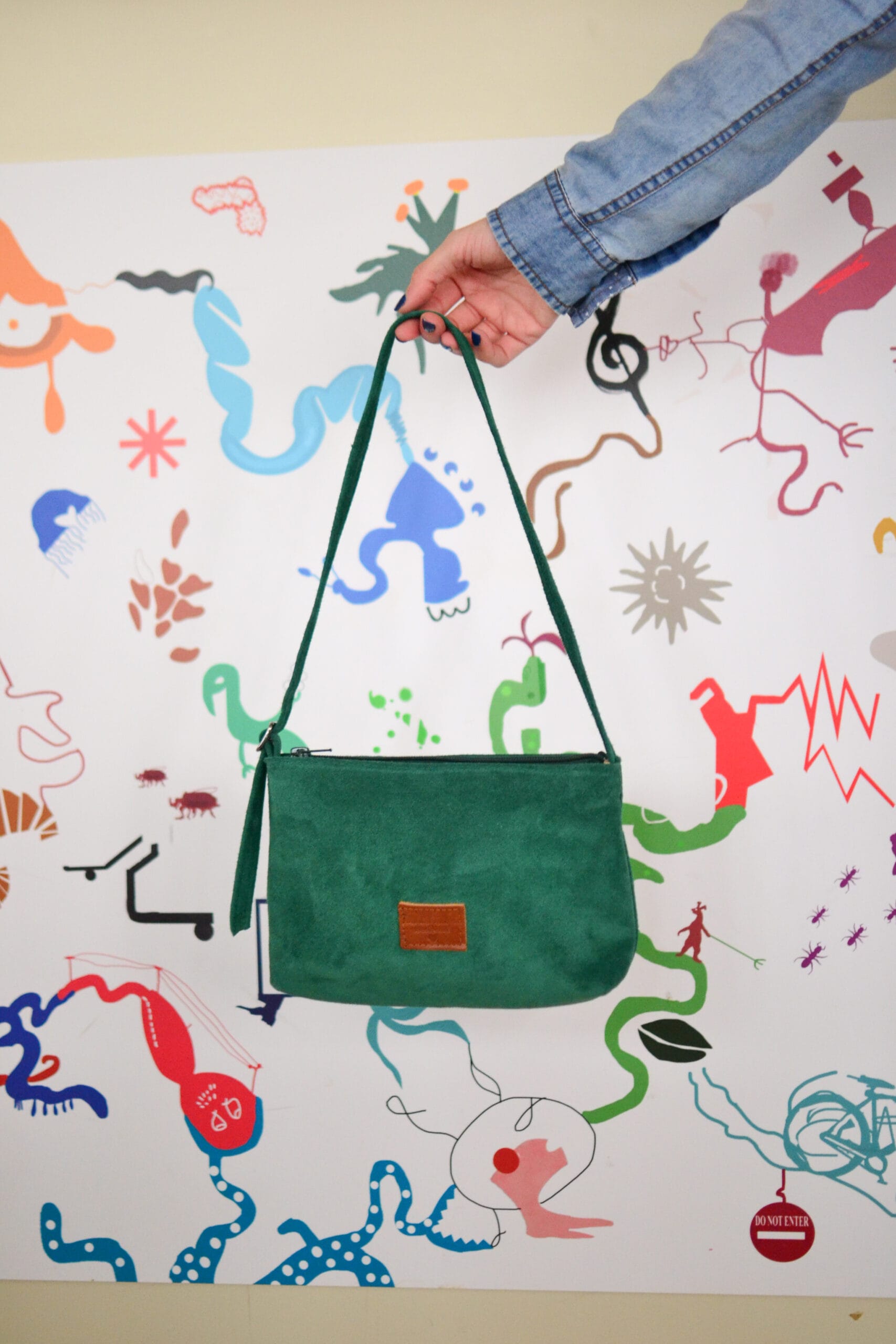 Δερμάτινο, suede τσαντάκι με αποσπώμενο δερμάτινο λουράκι, που φοριέται στο ώμο και χιαστί.