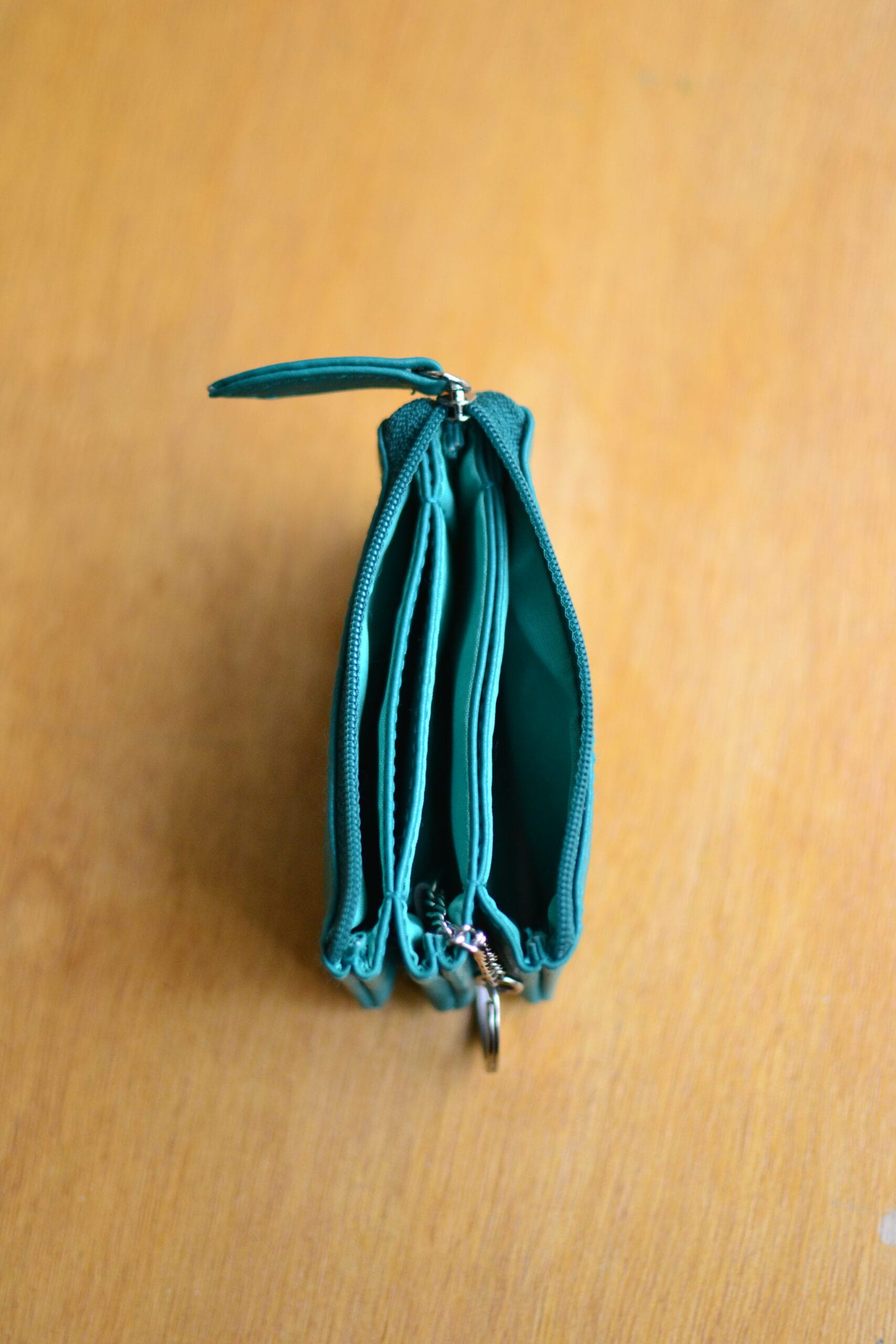 Δερμάτινο, μικρό πορτοφολάκι με φερμουάρ. Διαθέτει τρεις κύριες θέσεις και δύο μικρότερες.