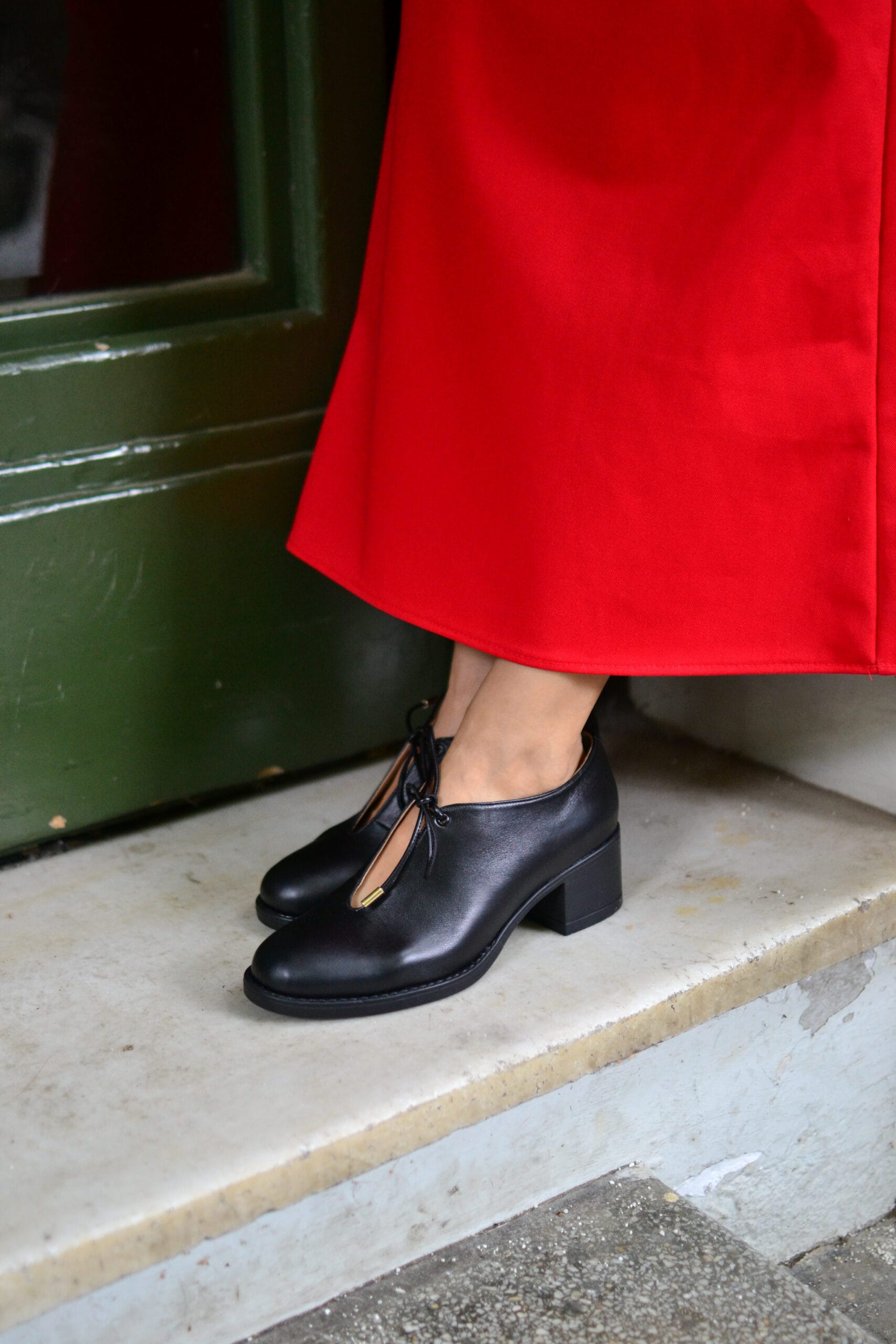 Δερμάτινα, δετά παπούτσια με μεσαίου ύψους τακούνι. Διαθέτουν πέλμα από θερμολάστιχο.